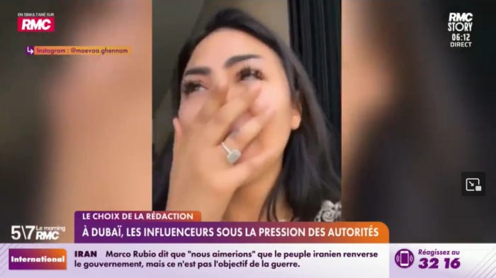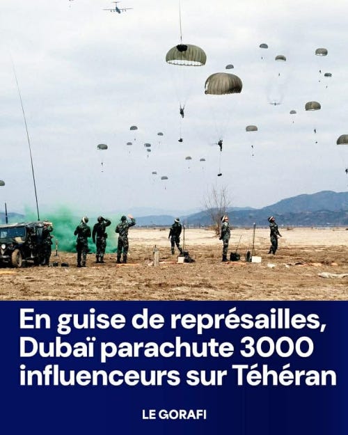 🟠 În prima zi de război, influencerii arabofrancezi din Dubai au rupt rețelele cu live-uri dramatice cu orașul bombardat, implorând autoritățile franceze să-i salveze din acest iad de tip Dien Bien Phu în care au rămas captivi. Postările au avut un engagement foarte bun, sute și mii de răspunsuri la comentarii, printre care și cel al autorităților din emirat, care i-a avertizat pe urmașii lui Ahmedix și Omarix că răspândirea de zvonuri și informații care pot periclita siguranța publică se premiază cu 25.000 de euro și eventual și un pic de pârnaie.