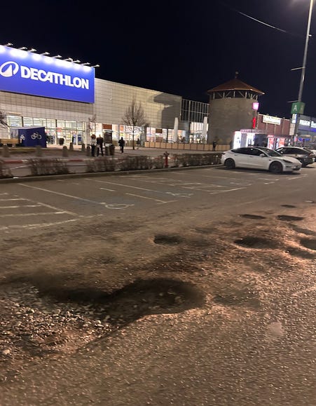 🟠 Mai multe gropi uriaşe în care îți poţi rupe mașina pândesc şoferii chiar la urcarea pe podul de la Vivo și peste tot în parcare. Până mai adună mall-ul nişte bănuţi ca să le poată astupa, poate bagă nişte amortizoare şi băi de ulei la Decathlon, să nu mai căutăm în altă parte.