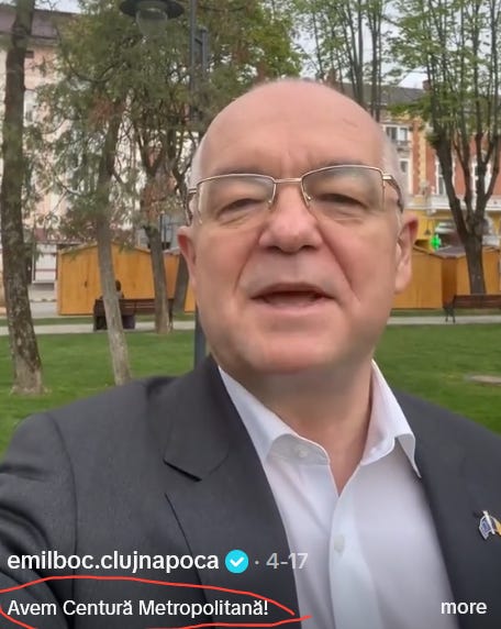 🟠 Emil Boc a declarat că - nici mai mult, nici mai puţin - AVEM centură metropolitană! „Avem o centură metropolitană de 42 de km, cu 20 de noduri rutiere, cu 35 de km de pistă de bicicletă, cu cinci tunele. Întotdeauna reușim împreună” - vă dăm și tiktok-ul dacă nu credeţi că aşa a zis. Deci avem centură, avem metrou, avem Someş navigabil, și toate astea pentru că avem un primar bun, înalt de 1.90 m, care nu ne ia de fraieri.