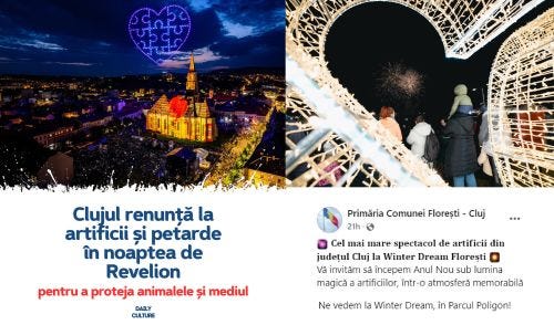 🟠 Revelion la Cluj, fără artificii, doar cu drone şi jocuri de lumini. Primăria a renunţat la artificii pentru "a proteja animalele şi mediul", dar clujenii gospodari şi-au făcut deja stocul de pocnitori şi vor bubui ei din balcoane. Iar dacă asta nu va fi suficient, Primăria Floreşti a anunţat că sperie ea şi animalele din Cluj, gratuit, cu "cel mai mare foc de artificii din judeţ". 🤦♂️