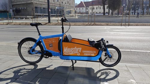 🟠 Trei tineri clujeni au creat "Mănăștura", o bicicletă electrică cu ataş care te ajută să faci cumpărături sau să duci copiii la grădiniţă. Motorul are o autonomie de 100 de km, iar portbagajul suportă o greutate de 180 de kg, adică multe produse din magazin, vreo doi-trei copii sau o Dacia Spring, dacă rămâi fără baterie prin Mănăştur.