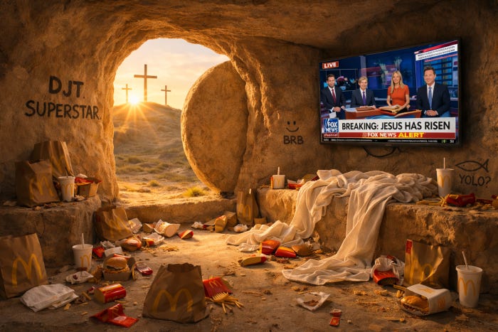 🟠 Între timp, Trump a şters poza pe care nu a apreciat-o nimeni şi a pretins că în imagine nu era Iisus, ci un medic: „E un doctor care face oamenii bine. Şi eu chiar fac oamenii bine”, adică exact ce spune orice pacient de la Obregia imediat ce-și trage halatul pe el.