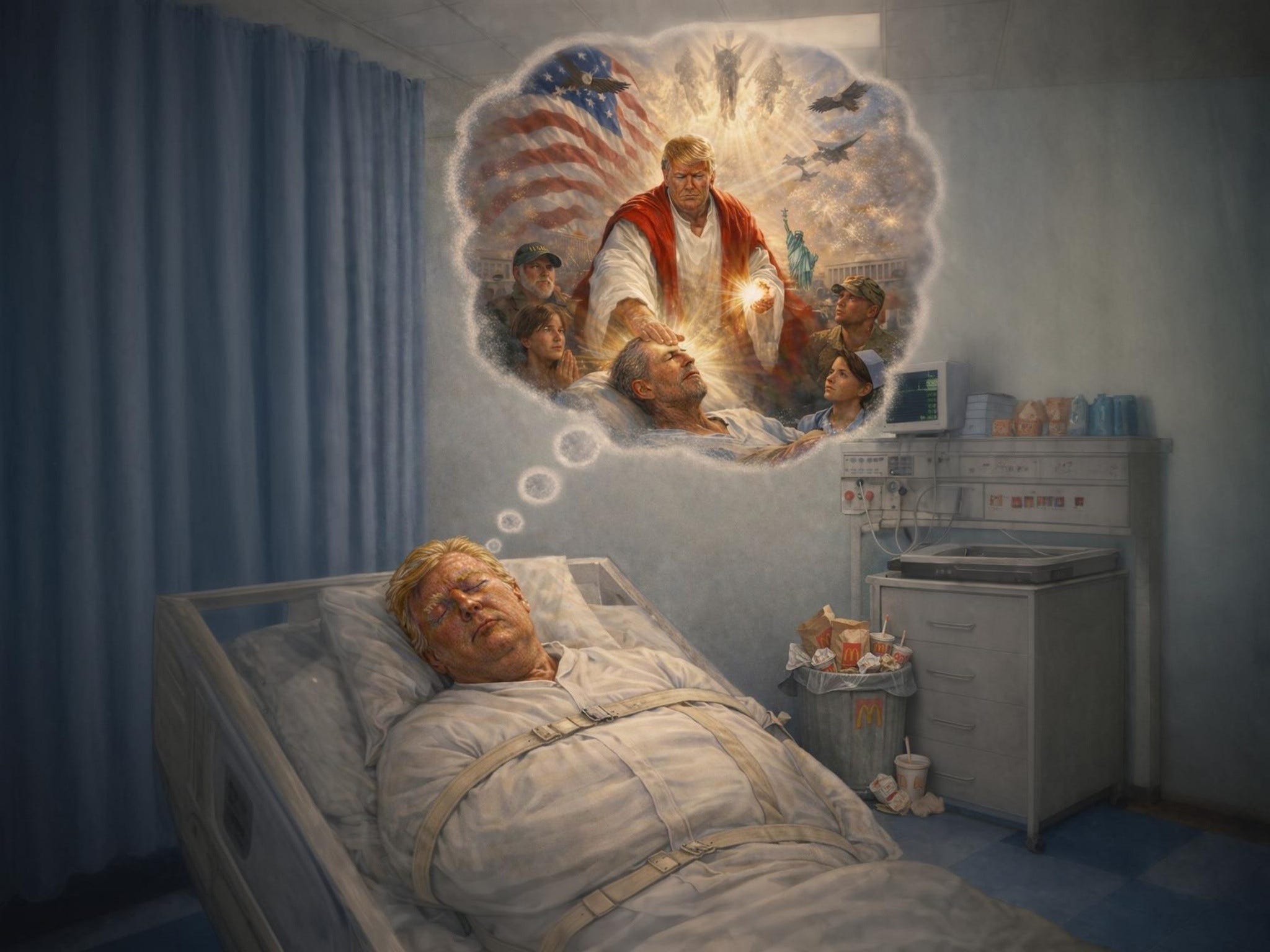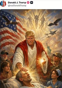 🟠 La scurt timp după ce l-a atacat pe papa Leon spunând despre el că e „groaznic în politica externă”, Donald Trump a postat pe Truth Social o poză generată de AI care îl înfățișează asemeni lui Iisus la căpătâiul unui bolnav pe care îl vindecă atingându-l cu mâna. Singura diferență dintre Donnie și Iisus, care era un exponent al stângii radicale, este aceea că președintele Trump îi vindecă doar pe bolnavii cu asigurare de sănătate Platinum.