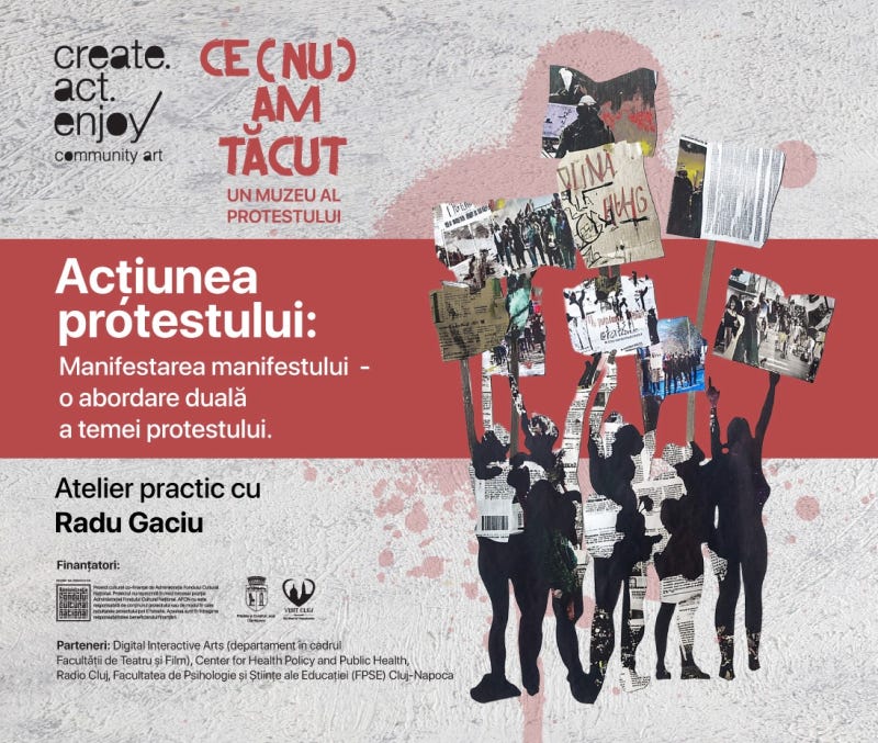 Atelierul lui Radu Gaciu este al treilea din proiect, după „Memoria protestului”, din 14–16 noiembrie, unde Anca Doczi Luchian i-a ajutat pe participanți să-și rememoreze și să-și povestească experiențele din proteste prin mișcare, voce și exerciții de imaginație, folosind metoda Memodrome (o tehnică de lucru cu amintiri, corp și narațiune) pentru a pune cap la cap trăirile fiecăruia, iar mâine, pe 19 noiembrie, avem „Puterea revoltei”, atelierul Anei Cucu Popescu care va folosi journal therapy pentru a transforma furia în text, poveste și un imn colectiv al revoltei. Detalii, pe pagina Create.Act.Enjoy.